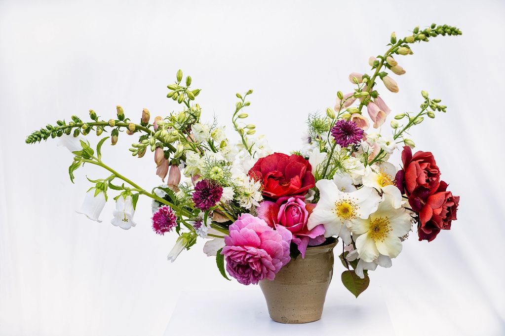Garden style compote bowl created @ the flower farm of Where Rosemary Grows, sourcing flowers locally.
